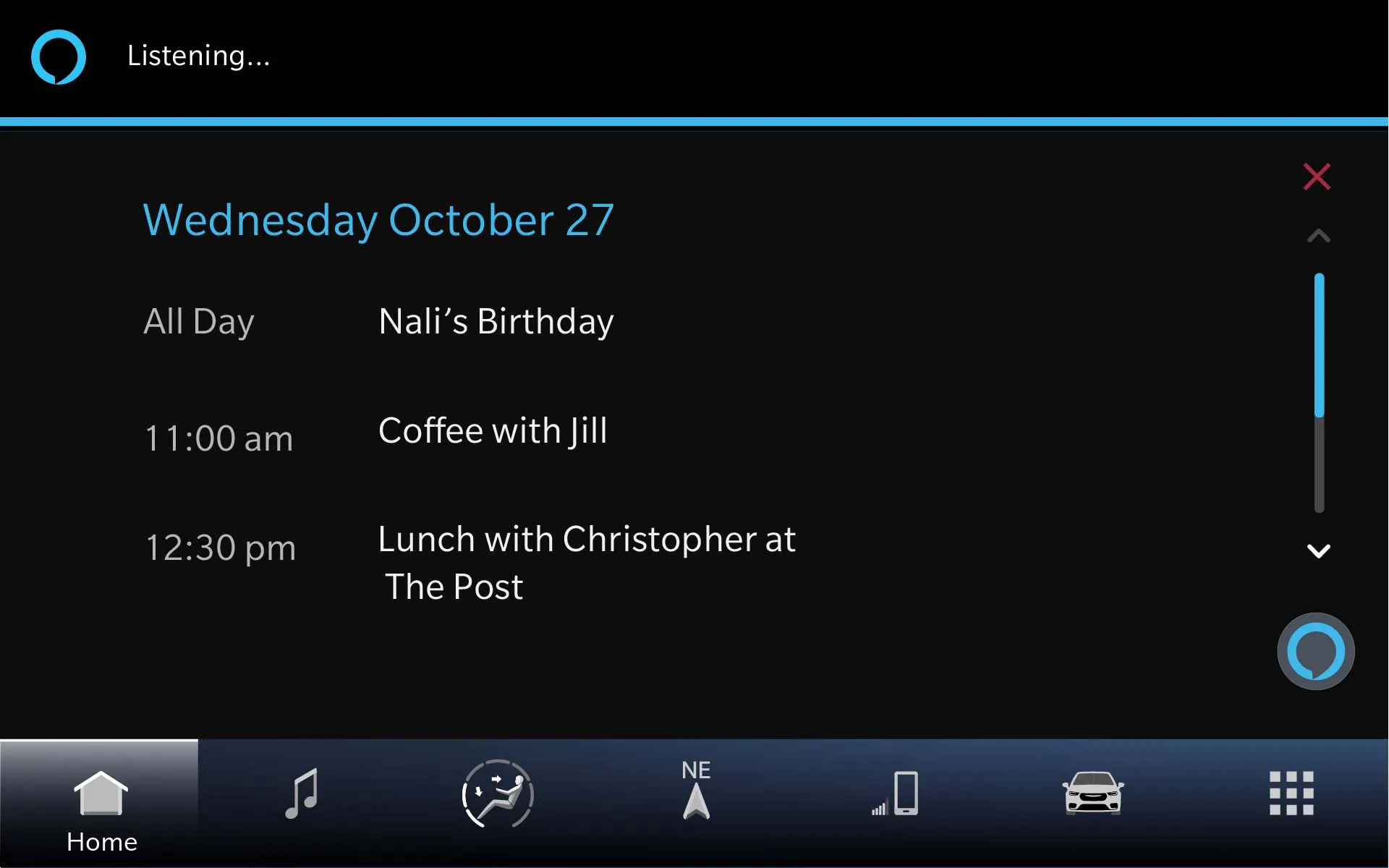 Alexa est entièrement intégrée au système et fonctionne via le bouton de commande vocale sur le volant. Le système offre des fonctionnalités de domicile à voiture et de voiture à domicile, permettant aux utilisateurs de démarrer et de verrouiller leur voiture à distance, de déverrouiller ou de verrouiller leur maison ou d'allumer les lumières de leur maison, le tout via Alexa à la maison ou en voiture. La reconnaissance vocale naturelle est implémentée afin que les utilisateurs puissent simplement utiliser un "Hey Chrysler" pour donner des commandes. Par exemple, en disant "Hey Chrysler, changez la température à 20 degrés" et le système changera la température à 20 degrés comme s'il s'agissait d'un assistant virtuel.